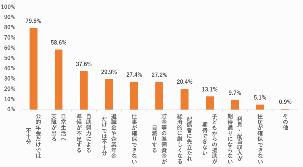老後生活に対する具体的な不安は以下のような結果となっており、資金面に関する不安が大きいことがわかります。
